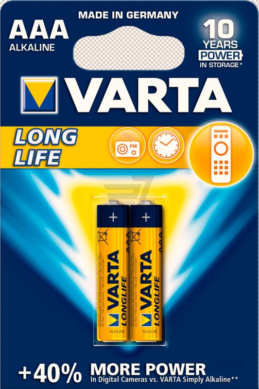 Батарейки Varta Micro Longlife Extra AAA 2шт — надежный источник энергии, предназначен для использования в игрушках, фонарях, пультах дистанционного управления, калькуляторах, часах и т.п. Оптимальное решение для устройств с постоянным невысоким энергопотреблением. В 4 раза больше энергии, чем у солевых батареек.