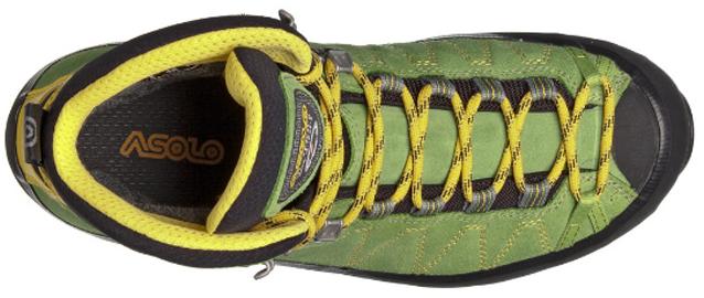 Ботинки Asolo Elbrus GV lime/mimosa — прочные, защищённые и водостойкие ботинки для горных походов. Ботинки построены на модели колодки с использованием подошвы многокомпонентной конструкции. В конструкции верха используется сочетание плотной натуральной кожи толщиной от 1.6 до 1.8 мм, с водостойким и паропроницаемым софтшелл материалом компании Schoeller. Нижняя часть модели защищена плотным слоем резины. Подкладка ботинок выполнена из двухкомпонентной мембраны Gore-Tex.