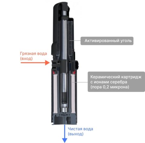 Вода очищается, проходя сквозь керамический картридж со сложной микропористой структурой. Диаметр поры картриджа составляет 0.2 микрона (0.002 мм)