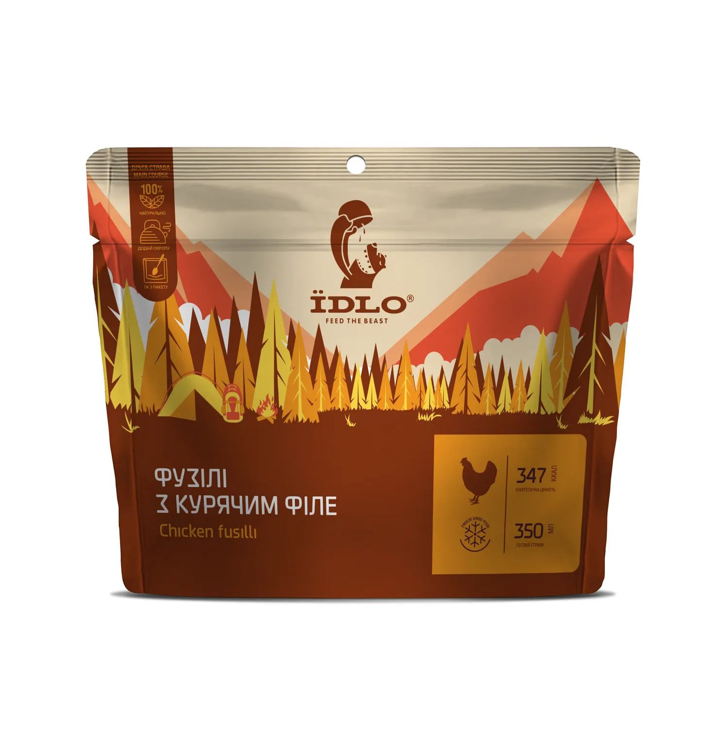 Фузилли с куриным филе IDLO — блюдо быстрого приготовления. Изготовлено для использования в походах, путешествиях, выездах на природу, кемпингах или командировках. Пакет содержит количество сублимата, рассчитанное на один прием пищи для взрослого человека. Упаковка с застежкой zip-lock может быть использована как миска.
