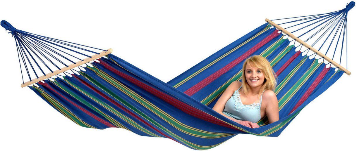 Гамак Amazonas Aruba Juniper Blue с деревянными перекладинами. Изготовлен из ткани EllTex®, которая представляет особую смесь полиэстера и хлопка, что обеспечивает дополнительную устойчивость к различным погодным условиям. Гамак можно спокойно оставить снаружи и под дождем, и под палящим солнцем. Кроме того, данная модель слабо выцветает и остается износостойкой даже при многократном намокании. Поверхность полотна приятна на ощупь – она мягкая, словно чистый хлопок.