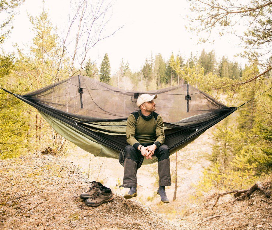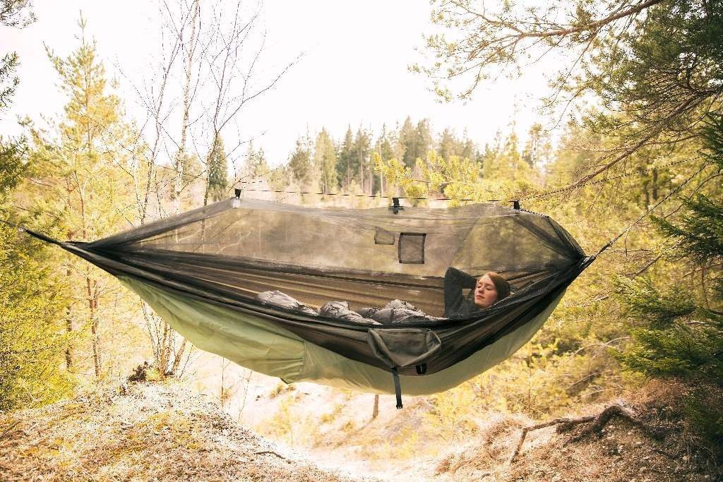 Особенностью Moskito Traveller Pro является возможность использования без сетки. Гамак выдерживает вес до 150 кг, так что можно брать его не только в поход, но и на природу для всей семьи. Гамак сделан из прочной нейлоновой ткани с защитой от брызг. Материал дышащий, очень мягкий и приятный к телу. Занимает мало места в сложенном виде — не больше бутылки. Москитная сетка пришита с одной стороны — с другой застегивается на молнию. Если москитная сетка не нужна — гамак можно просто перевернуть.