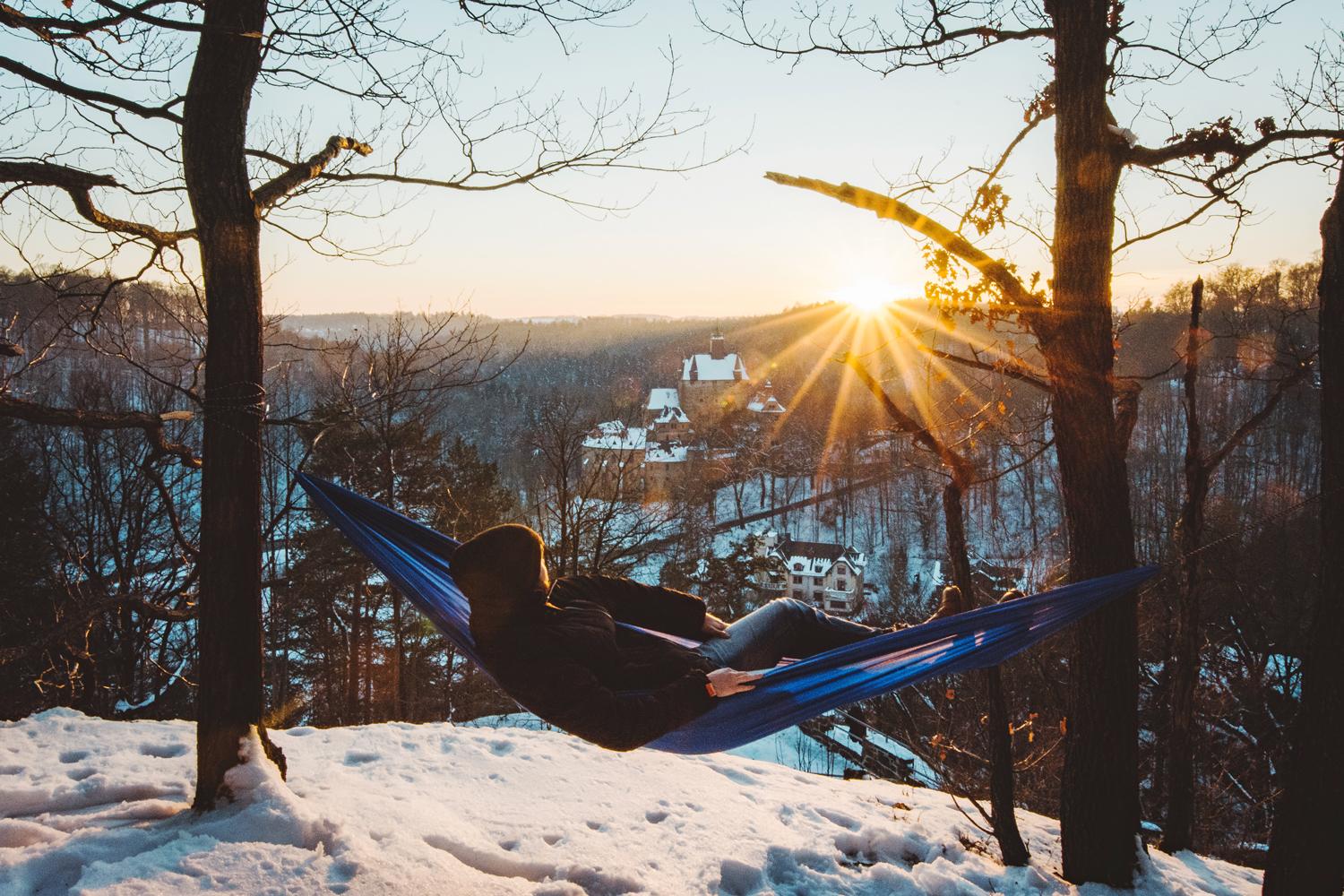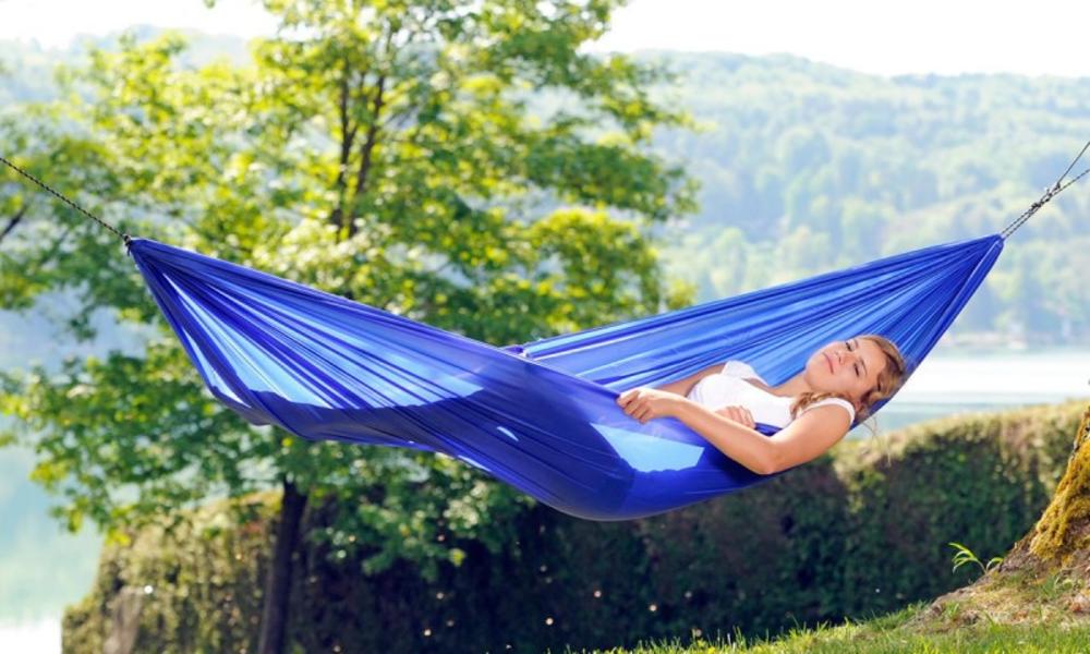 Гамак имеет в комплекте веревку и крючок для крепления. Просто обмотайте несколько раз веревку обоих концов гамака вокруг ствола дерева и зафиксируйте крючком.