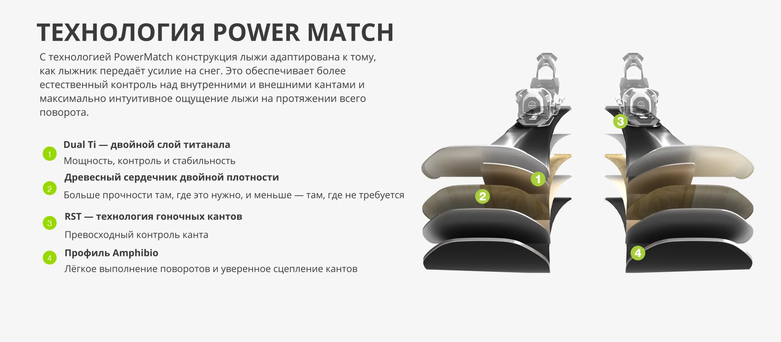 PowerMatch — это усовершенствованная версия технологии Amphibio, обеспечивающая идеальный баланс между хваткой на ледяном склоне и маневренностью. Внутренняя часть лыж усилена более толстой и жесткой древесиной для великолепной хватки кантов и стабильности. Внешняя часть лыжи имеет меньшую жесткость и толщину, что снижает вес и облегчает инициацию поворота.