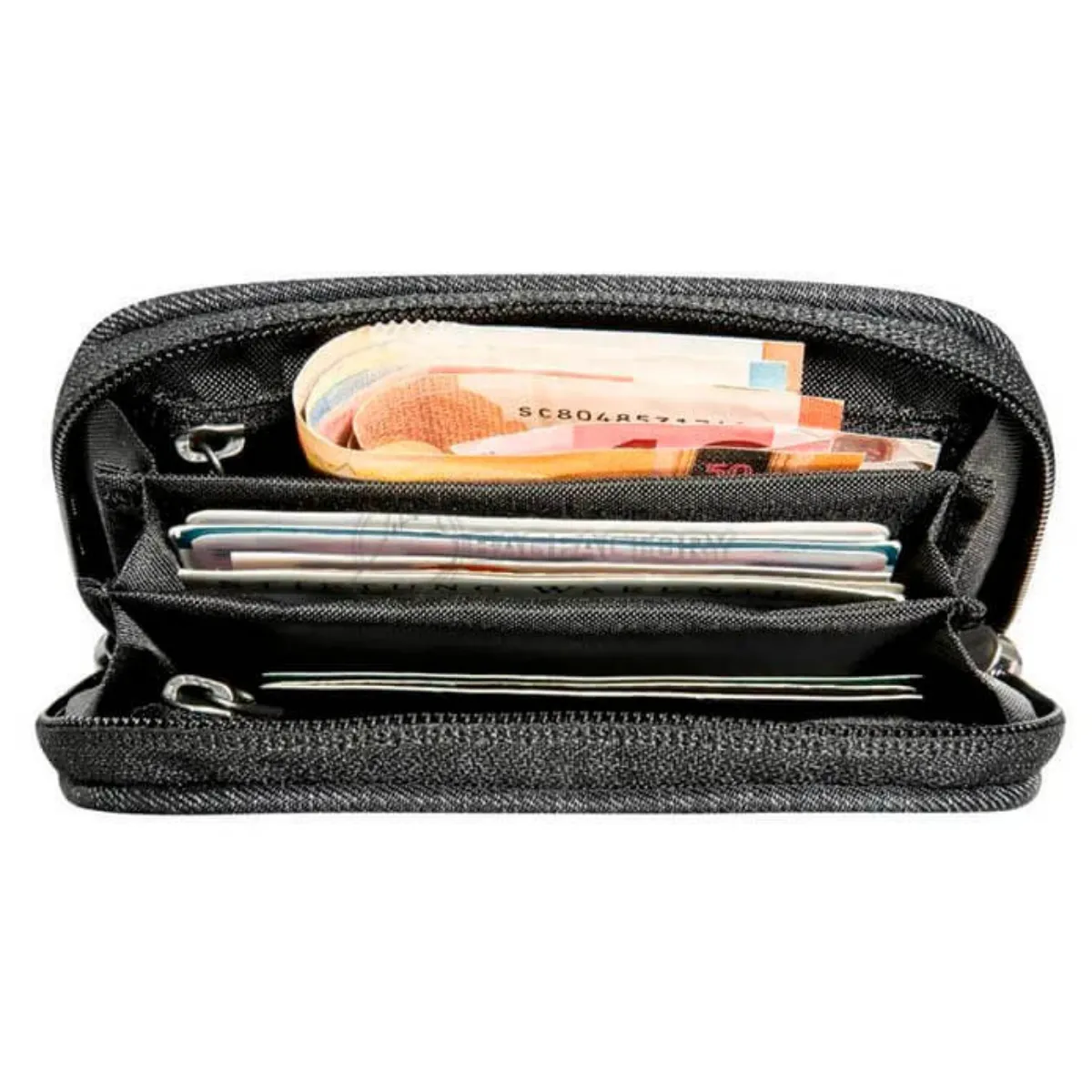 - Внутри расположены три больших отделения для купюр (подходят для разных валют), три кармана для кредитных карт и один внутренний карман на молнии для монет