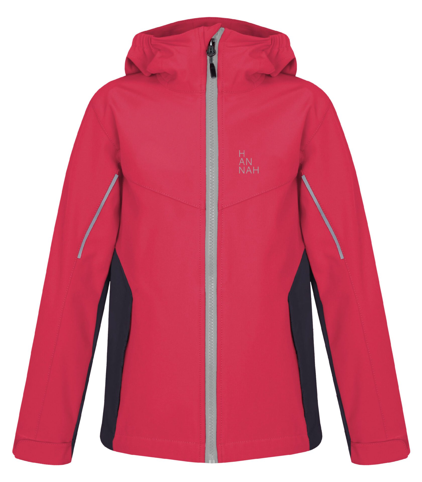 Hannah Carpa JR geranium/night — детская мембранная куртка изготовлена из водонепроницаемого, ветрозащитного и дышащего материала Softshell Extra Lite с мембраной 8000 и обработкой Teflon Eco Lite. Куртка имеет регулируемый нижний край, а также рукава с липучками. Имеет два основных кармана на молнии. Свободная посадка удобна и не стесняет движений. Светоотражающие элементы повысят безопасность ребенка на улице или в походе.