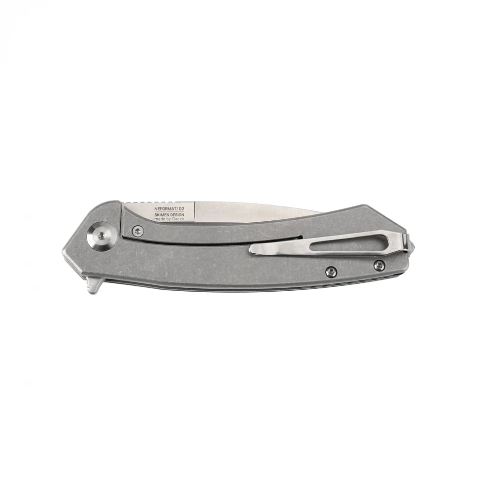 В составе ножа – сверхпрочная, стойкая к износу сталь марки D2. Защищённый от коррозии металлический сплав демонстрирует высокие показатели твёрдости. Значение твёрдости у ножа – порядка 60 единиц по шкале Роквелла, что очень хорошо для этого вида продукции. Тип заточки – прямой. Длина клинка составляет восемь с половиной сантиметров, толщина – три с половиной миллиметра. Нож складной, лезвие извлекается с помощью удобного замка Flipper. Skimen надёжным образом защищён от случайного открытия либо закрытия. Он безопасен в эксплуатации, и имеет простую конструкцию. Общая длина ножа всего 20,5 сантиметра. Такие небольшие габариты дают преимущество ножу для использования каждый день. Его можно легко положить в сумку либо карман, и применять по необходимости, модель всегда под рукой.