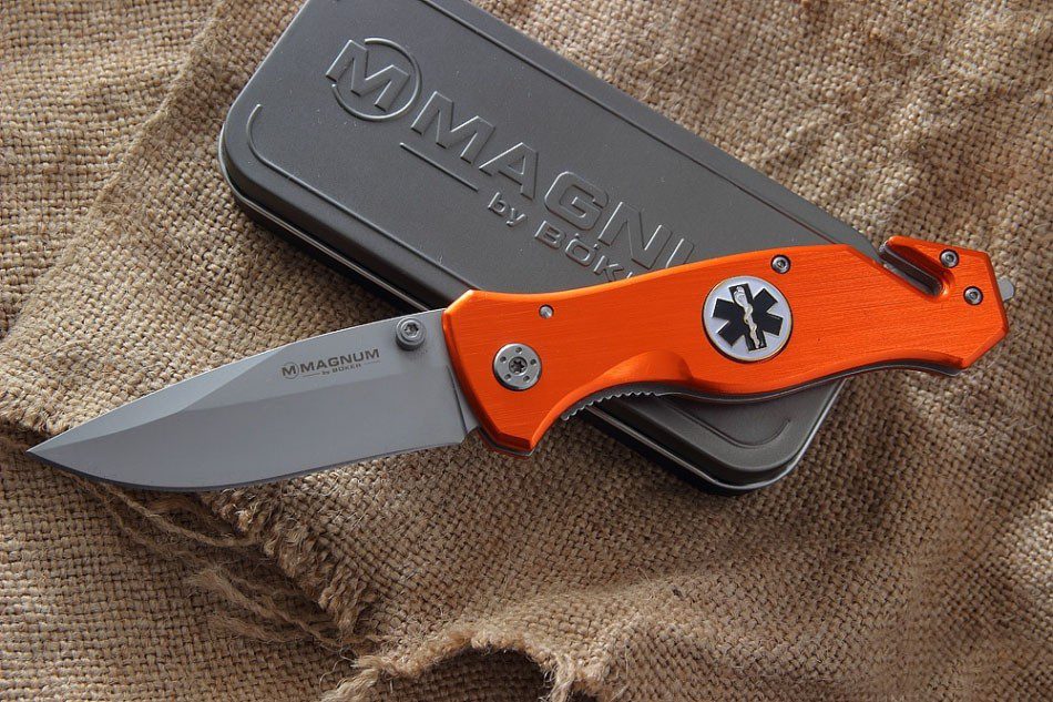 Нож Boker Magnum Medic — предназначен для проведения спасательных работ. Для этого предусмотрены яркие алюминиевые накладки на рукоятке. В случае необходимости нож сразу виден среди других инструментов. Нож полностью выполнен из металлических деталей. Конструкция не боится влаги и перепада температуры. Клинок рассчитан на разрезание материалов различной плотности. Резак-стропорез в тыльной части, предназначен для разрезания ремней безопасности. Ударный выступ в тыльной части, предназначен для разбивания стекол и пластика.