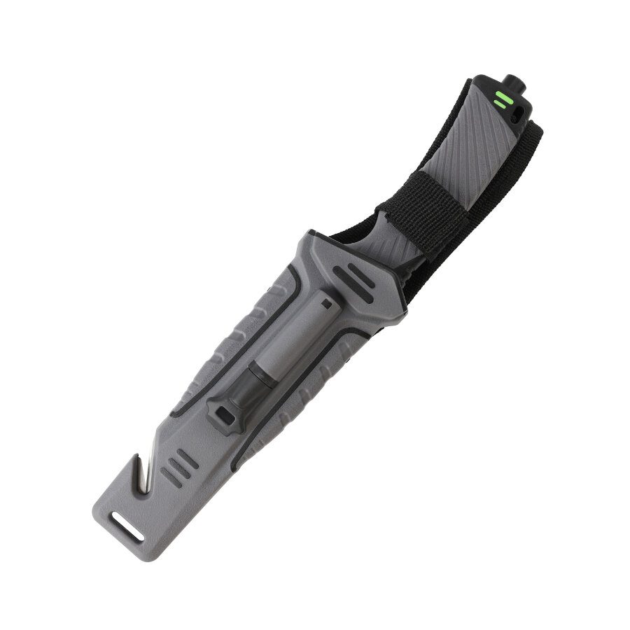 Рукоятка изготовлена из пластика ABS. Он относится к группе термопластиков, которые известны прочностью и долговечностью. Рукоятка в данной модели может комбинировать элементы черного и оранжевого цвета, либо черного и зеленого. В этих же оттенках выполнен и чехол для ножа. Он сделан из нейлона и пластика, а нож удерживает внутри при помощи застежки-липучки. С обратной стороны чехла встроена компактная металлическая пластина с алмазным напылением, которая является практичной и легкой точилкой для ровного участка лезвия. Кроме того, в чехол встроен стропорез, а в специальном гнезде закреплено вынимающееся огниво. В дополнение к этому, рукоятка ножа оканчивается небольшим плоским выступом, выполняющим роль стеклобоя.