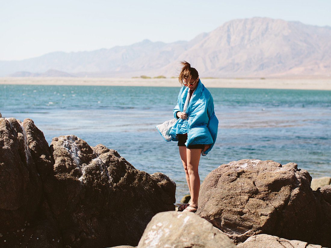 На нижнем крае одеяла есть шнурок, который позволяет укутывать ноги, уменьшая поддуваемые зоны. Покрывало можно сложить в собственный карман на молнии.
