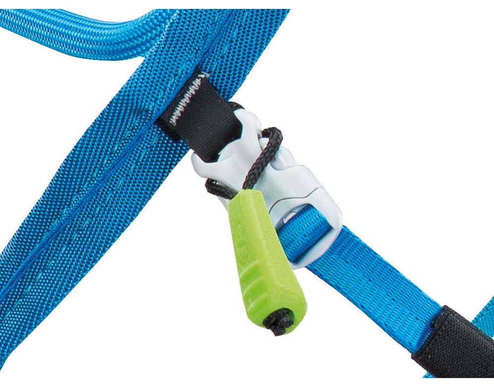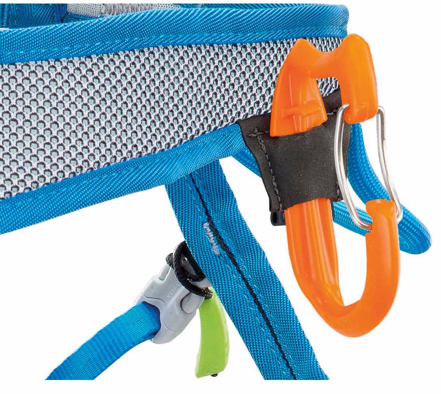 - Лямка, контактирующая со страховочной петлей, оснащена антиабразивным металлическим изделием