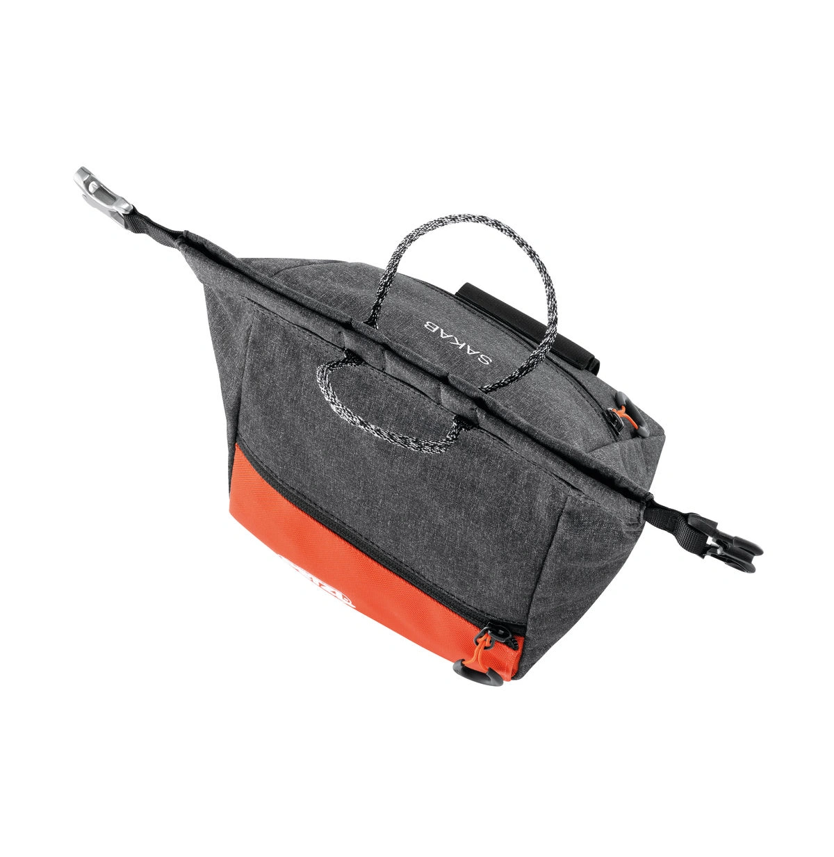 Petzl Sakab — сумка для магнезии, созданная для боулдеринга. Предназначена для размещения на земле. Полу-жесткая конструкция очень устойчива, а раскрытие достаточно большое, чтобы разместить там обе руки. На сумке есть магнитная застежка, а чтобы полностью закрыть ее, верхнюю часть нужно скрутить и застегнуть на пряжку-фаст. Две ручки для комфортной транспортировки, также сумку можно подвесить на высоте рук за одну из лямок. Сумка очень практична, там есть держатель для щетки, а также два кармана на молнии для раздельного хранения вещей.
