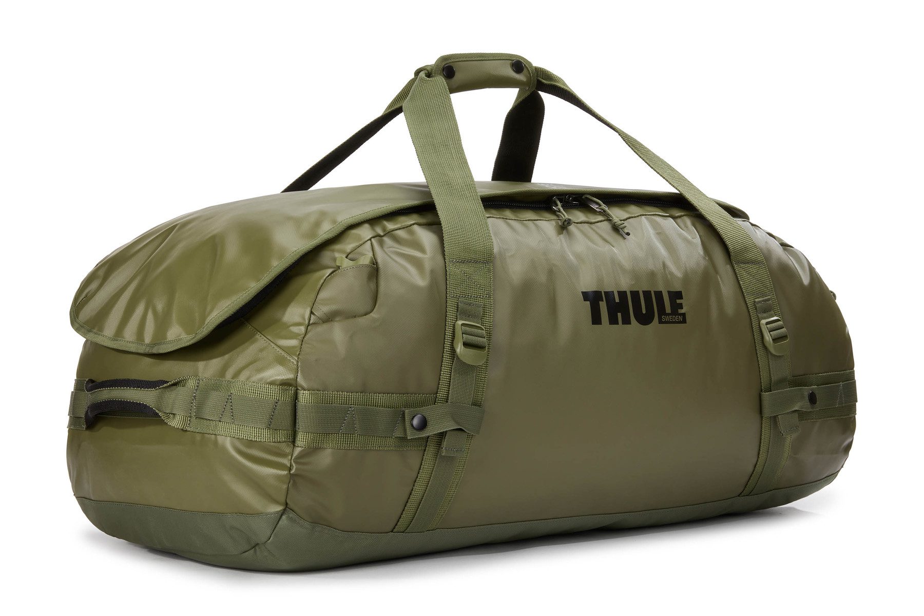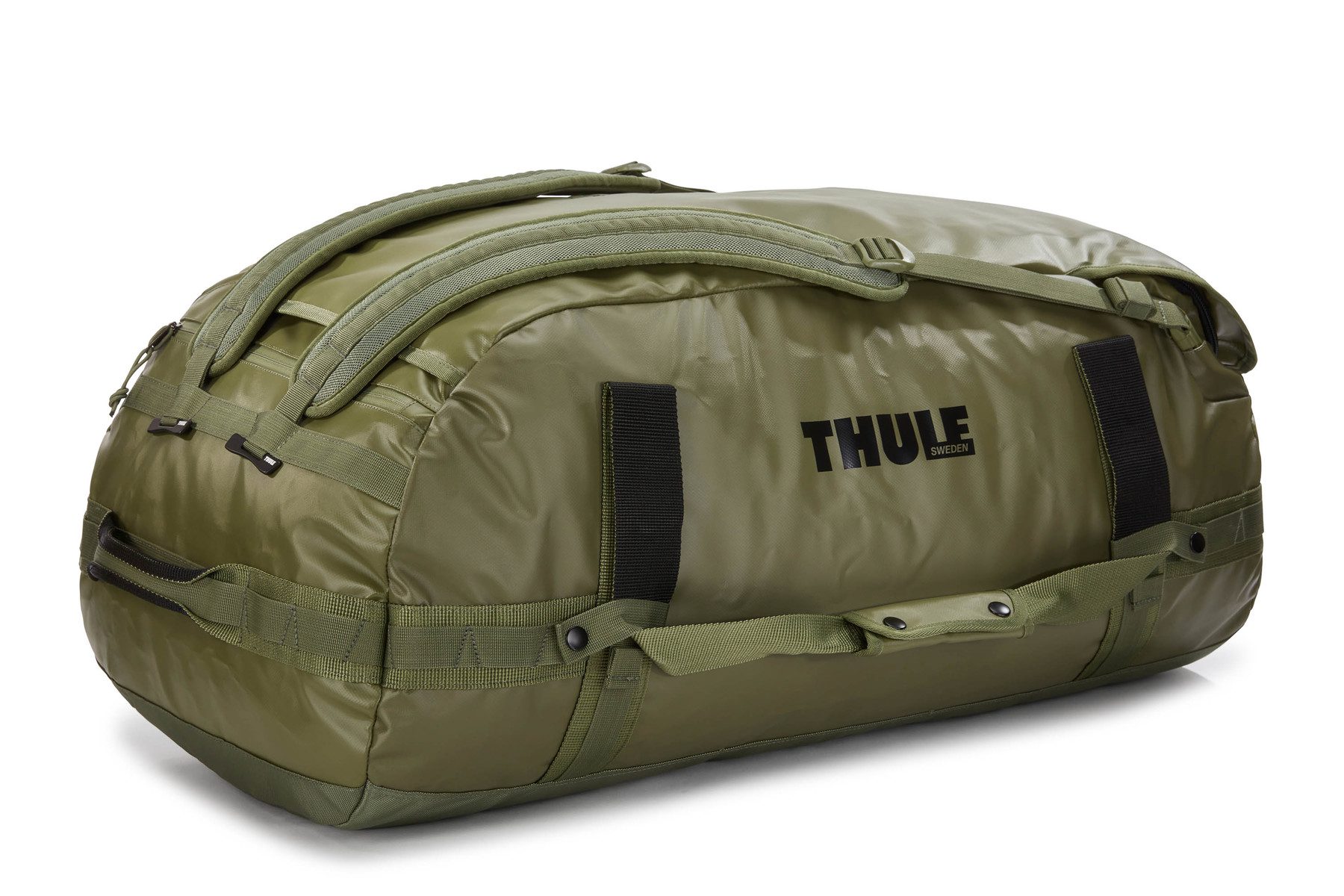 Thule Chasm 90L oliveine — прочная, всепогодная спортивная сумка со съемными ремнями рюкзака и большим углом открывания.