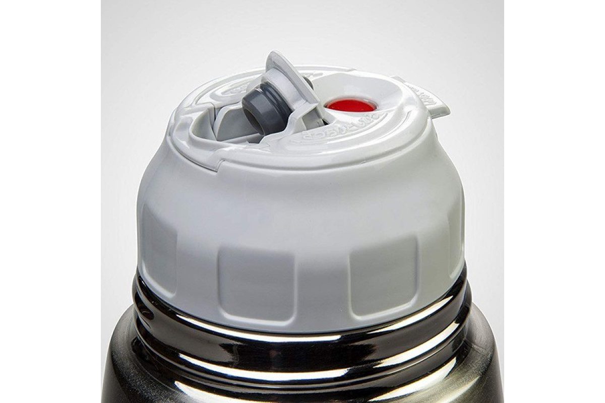 Клапан на кнопочном механизме работает от нажатия. При нажатии открывается специальный носик с небольшим отверстием. Через него легко наливается напиток, и минимально теряется температура. В случае если забыли закрыть, при накручивании верхней крышки закрытие произойдет автоматически без проливания жидкости.