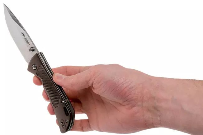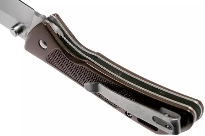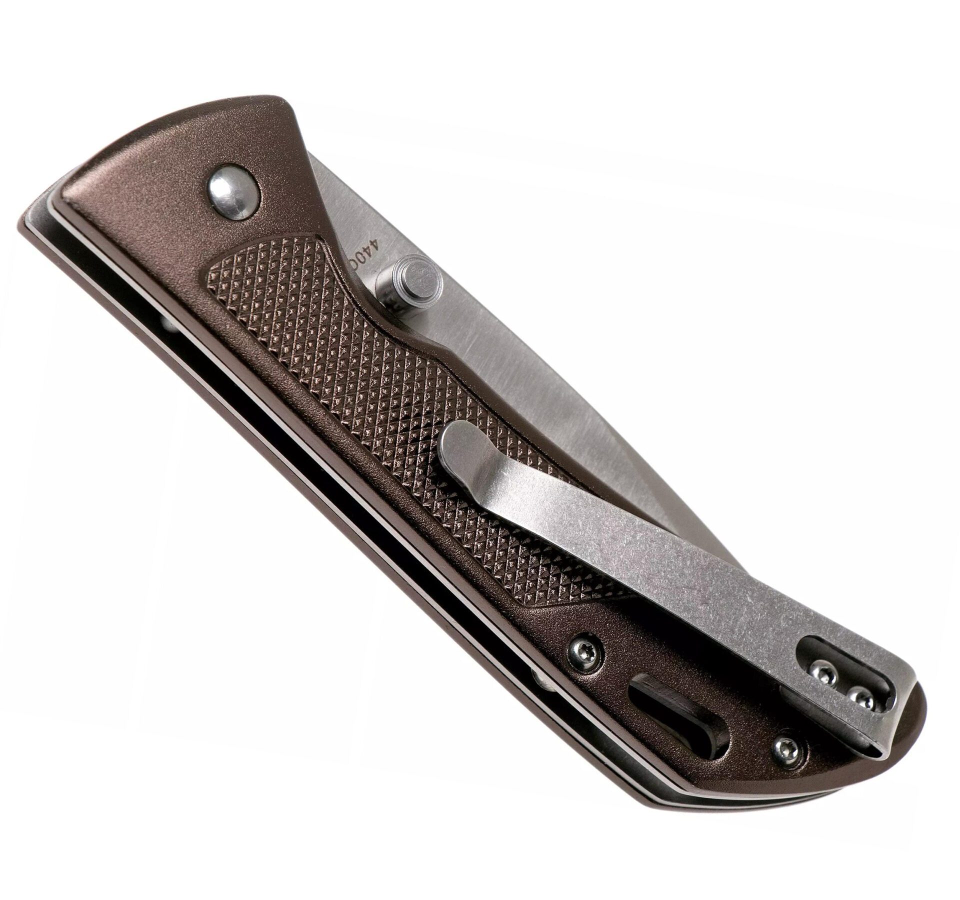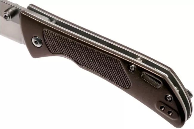 Boker Magnum Advance Dark Bronze — un cuțit pliabil la îndemână pentru uz zilnic. Căptușelile din aluminiu ale mânerului cuțitului au o textură pronunțată pentru o prindere mai sigură. Lama versatilă din oțel inoxidabil 440C se deschide cu un ax și se fixează cu o încuietoare de căptușeală.