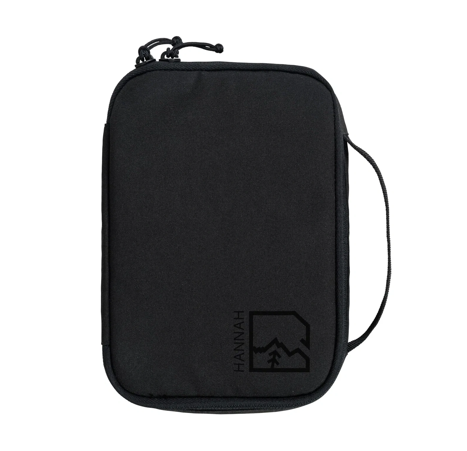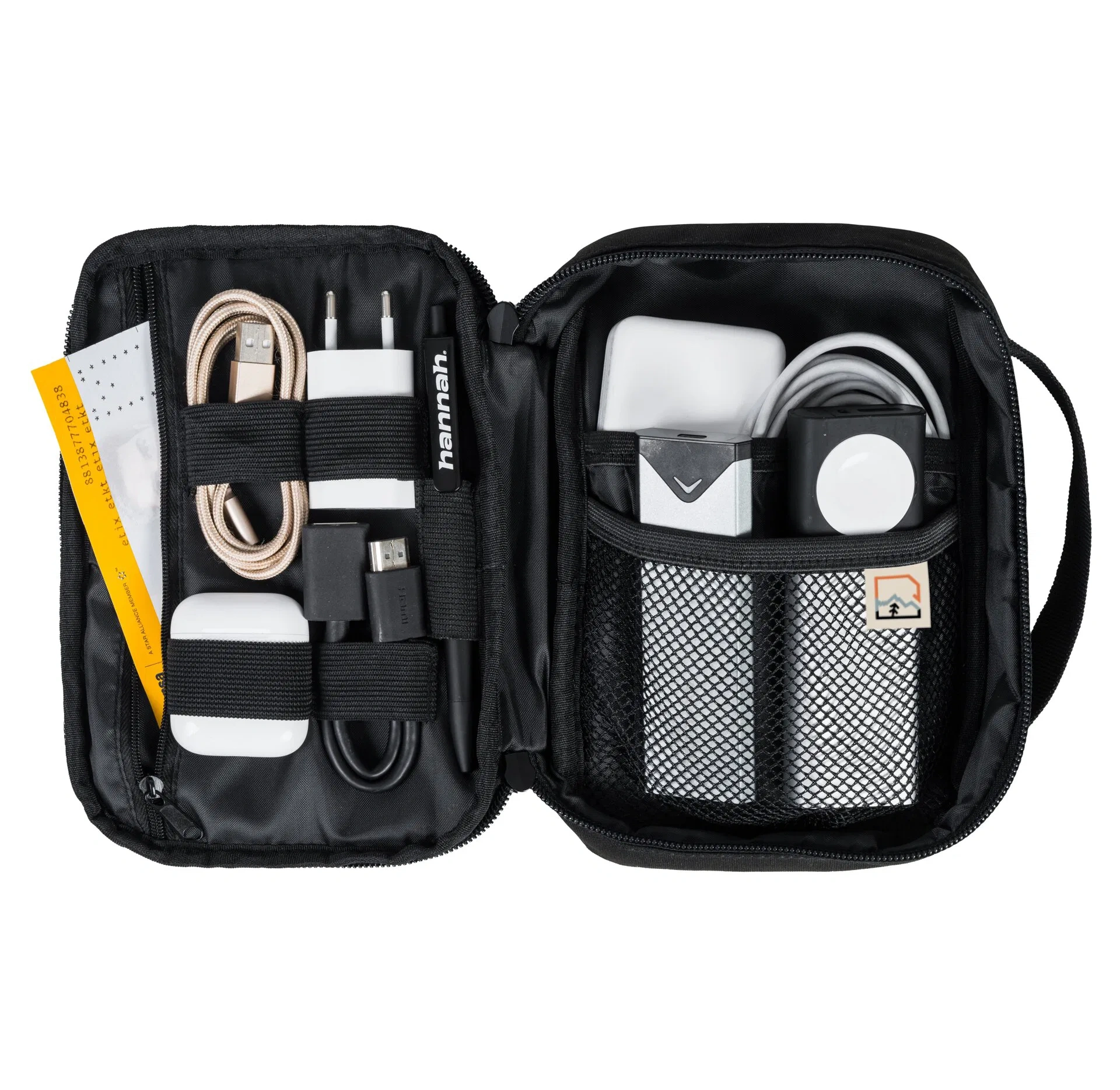 Hannah Travel case — este un organizator de călătorie fabricat din poliester reciclat. Husa este dotată cu un fermoar pe toată lungimea și pereți căptușiți pentru o protecție suplimentară a conținutului. La interior, acesta dispune de un compartiment pentru baterie externă (power bank) sau încărcător, un buzunar din plasă pentru mouse și un buzunar suplimentar cu fermoar. Curelele elastice ajută la fixarea accesoriilor mici. Este soluția ideală pentru excursii și călătorii de afaceri.