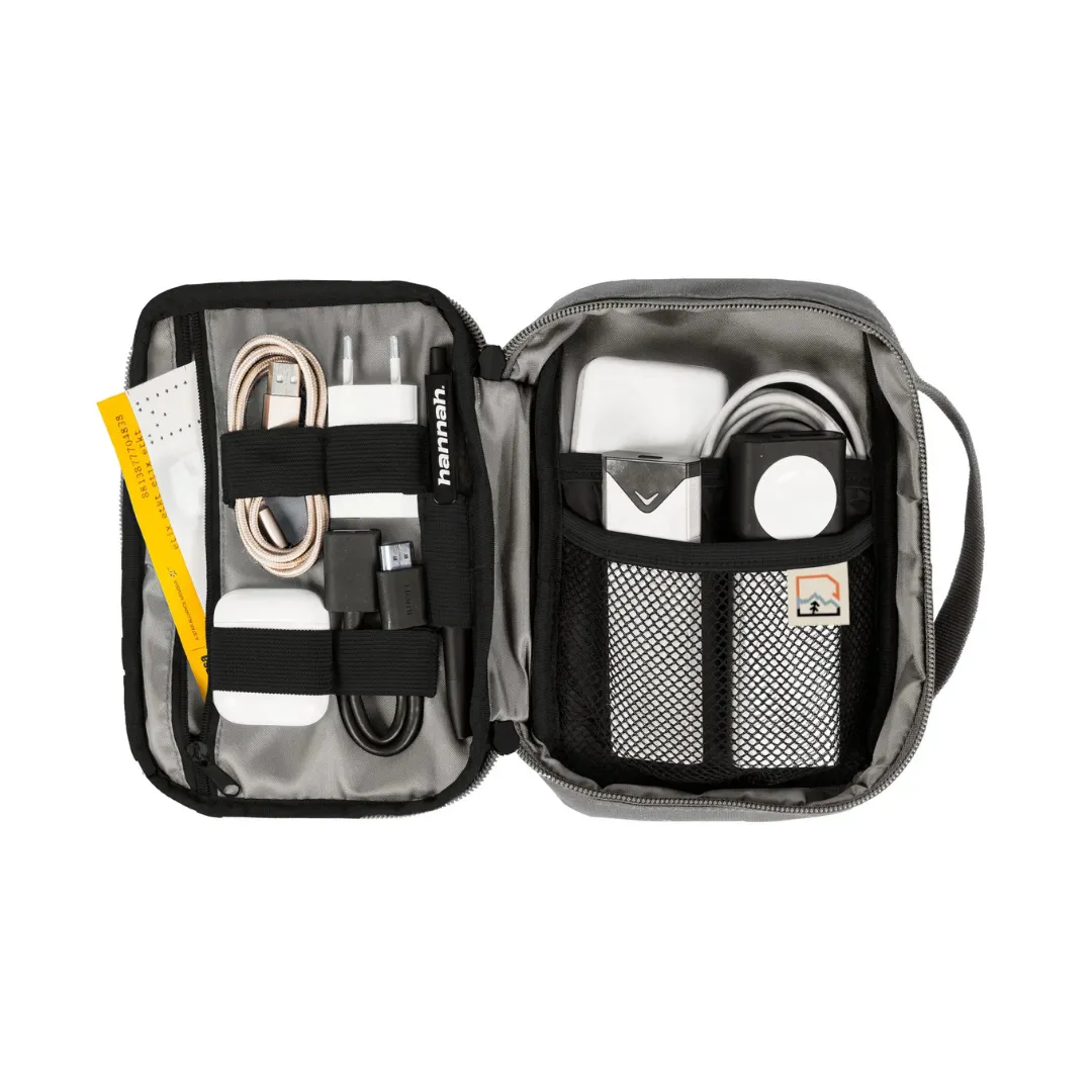 Hannah Travel case — este un organizator de călătorie fabricat din poliester reciclat. Husa este dotată cu un fermoar pe toată lungimea și pereți căptușiți pentru o protecție suplimentară a conținutului. La interior, acesta dispune de un compartiment pentru baterie externă (power bank) sau încărcător, un buzunar din plasă pentru mouse și un buzunar suplimentar cu fermoar. Curelele elastice ajută la fixarea accesoriilor mici. Este soluția ideală pentru excursii și călătorii de afaceri.
