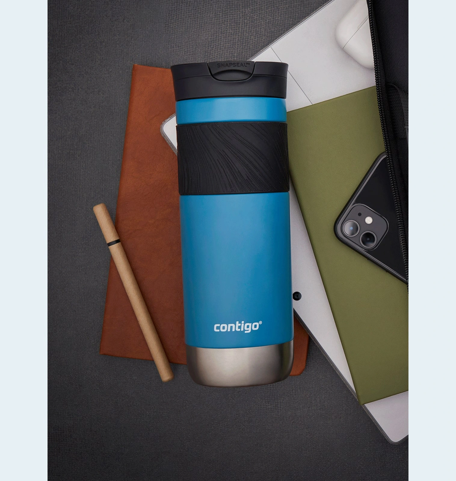 Cană termică Contigo Byron 590ml — datorită izolației cu vid, băuturile rămân fierbinți timp de 7 ore sau la rece timp de 18 ore. Carcasa este fabricată din oțel inoxidabil. Etanșeitatea este menținută datorită tehnologiei SNAPSEAL.